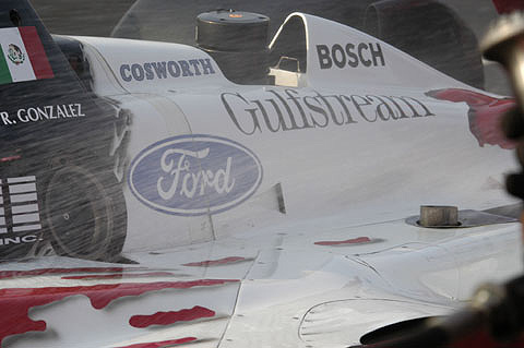 Water Spray: Water is sprayed on the side of Roberto Gonzalez's car to prevent fire at the end of his pit stop.
