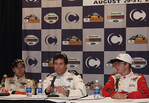 Bruno In The Middle: Bruno Junqueira finds himself in the best seat at the post race press conference thanks to another win which got him closer to Paul Tracy in the battle for the Vanderbilt Cup.