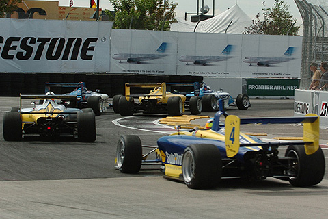 Back With Original Team: David Martinez (4), seen here trailing a pack of cars, got the funds together to switch back to his original team, US RaceTronics. It didn't help him this time as he finished tenth.