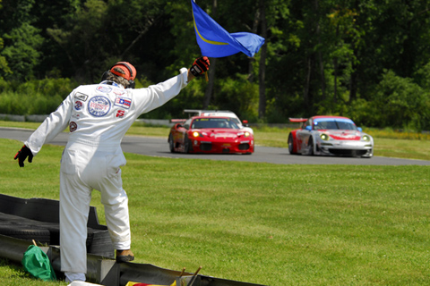 Busy Flagger: The corner workers responsible for the blue flag got quite a workout thanks to constant traffic on a small track with four different classes.