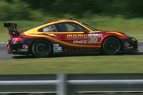 Downhill Tire Wall: The MOMO sponsored car caused the late race full course yellow. They came down on another car at the ultra-fast Downhill, causing the #30 Porsche 911 GT3 Cup car to end up in the outside tire wall. This caused Henrique Cisneros and Nicolas Armindo to finish last in GTC.