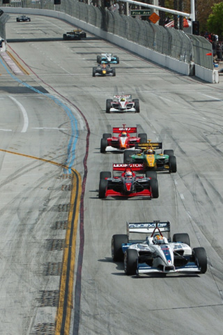 Surprise Starter: Oriol Servia wasn't expected to be racing at Long Beach, but found himself leading a pack of cars heading into turn one.