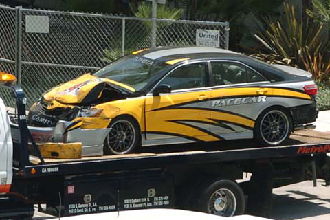 Overexuberant VIP Ride: This Toyota pace car, used for VIP drive arounds, provided its passenger with more than they bargained for. The driver lost control, slamming into the tire wall in the runoff area.