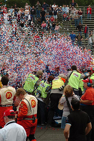 Finally!: Somewhere in the middle of the winner's circle confetti shower is A.J. Allmendinger, enjoying his first victory.