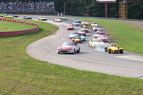 Heading Off: The E Production Mazda RX-7 of Tom Thrash heads off the track after the controversial contact between him and Buddy Norton's Caterham 7 (the tire smoke from the contact on the Caterham can still be seen).