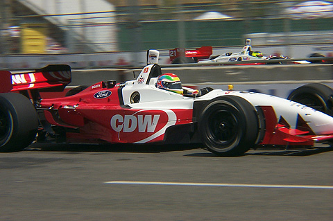 Justin Finally Wins: A solid weekend, taking advantage of other mistakes, and a well planned out pass for the lead were all ingredients in Justin Wilson's and RuSport's first win. Here, he's in pitlane as Cristiano da Matta goes by on the track.
