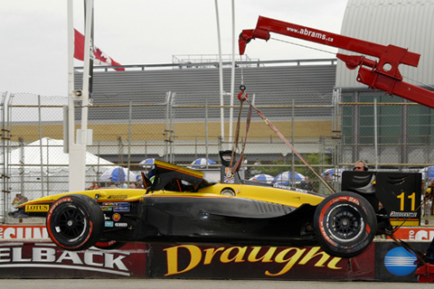 Ran Into Tracy: The remains of Katherine Legge's car is hauled away after she ran into the back of Paul Tracy who crashed into the wall on the first lap.